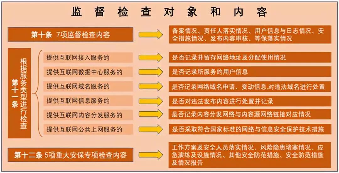 对第十条、第十一条进行解读,可以得出监督检查更加注重系统日常管理的合规性。如备案情况、责任人落实情况、用户信息与日志情况、安全措施情况、发布内容审核、等保落实情况等。针对六种服务类型,提出了针对性的检查内容,类型包括提供互联网接入服务的、提供互联网数据中心服务的、提供互联网域名服务的、提供互联网信息服务的、提供互联网内容分发服务的、提供互联网公共上网服务。